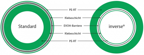 由于其“逆转”5 层结构,该管道可为氧气阻隔层提供特别强大的保护- 即使在最苛刻的安装情况下也能免受外部影响。